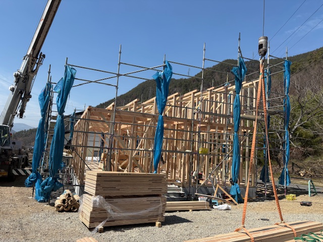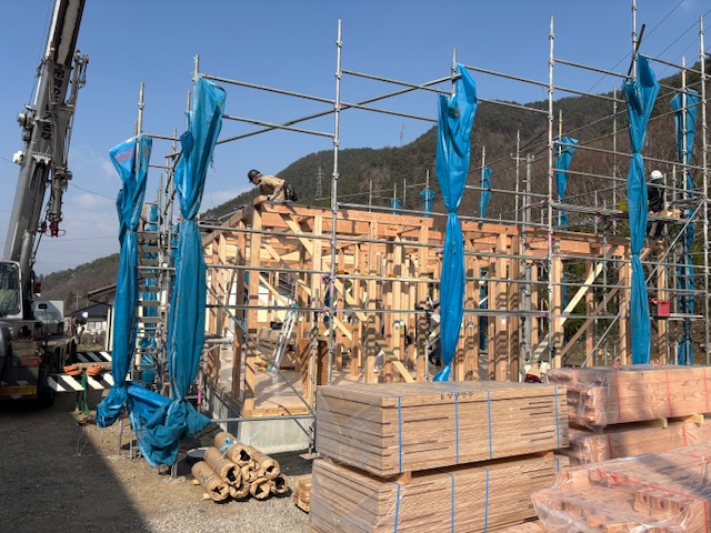 長野の冬の厳しい寒さから、ようやく春の訪れを感じるこの日、新しいお住まいの骨組みが一日で一気に組み上がりました。