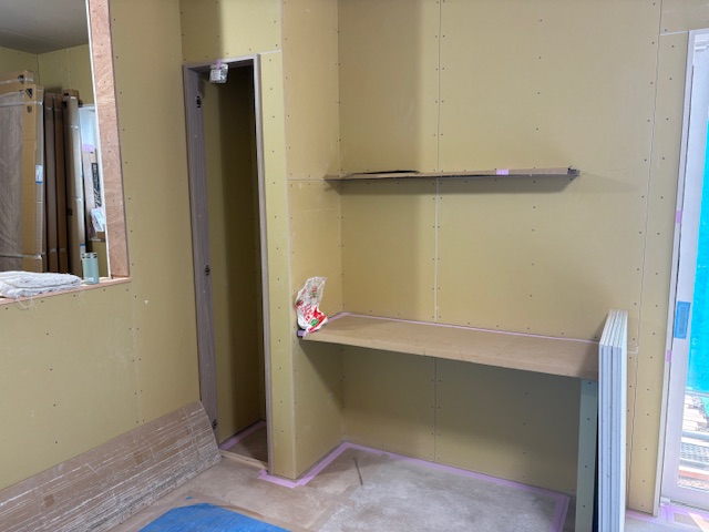 石膏ボードが張られると、それまでの骨組みの状態から一気に「部屋」らしい空間へと変わりますね。写真にあるようなデスクカウンターや収納棚は、ミリ単位の調整が必要な職人技の見せどころ。未来のご家族がここでどんな風に過ごされるかを想像しながら、丁寧な仕上げを心掛けています。