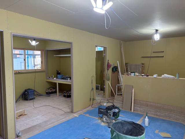 千曲市のM様邸では、壁のボード張りと建具枠の取り付けが一段落しました。