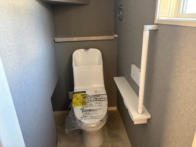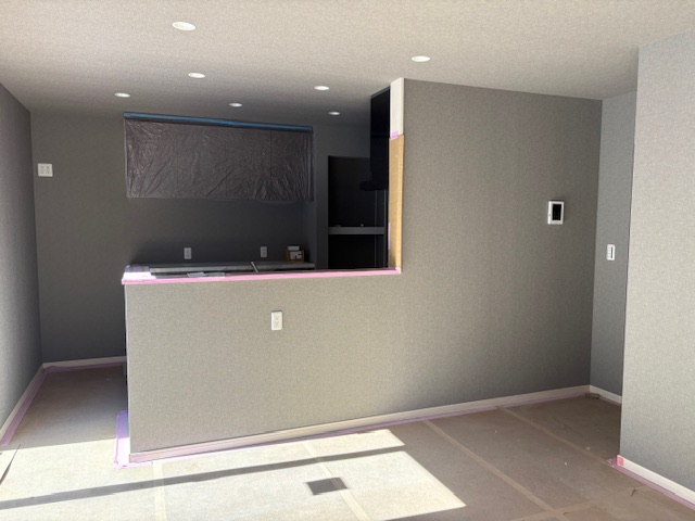 キッチン周りやトイレなど、グレーを基調とした落ち着いたトーンのクロスが、空間に「上質感」と「心地よさ」を与えています。養生シート越しでも、新しい暮らしのワクワク感が伝わってきますね。