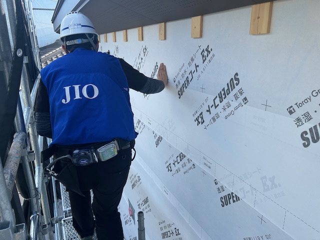 この検査は、躯体検査の後に外装下地(防水紙、防水テープ等)の施工状態を確認するためのものです。
