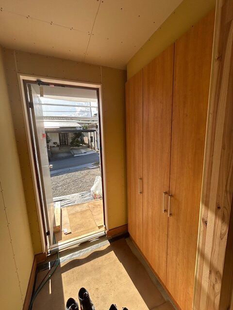 この検査は、躯体検査の後に外装下地(防水紙、防水テープ等)の施工状態を確認するためのものです。