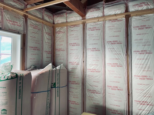 長野市安茂里のO様邸では、家づくりで大切な壁・天井の断熱材の充填が完了しました。