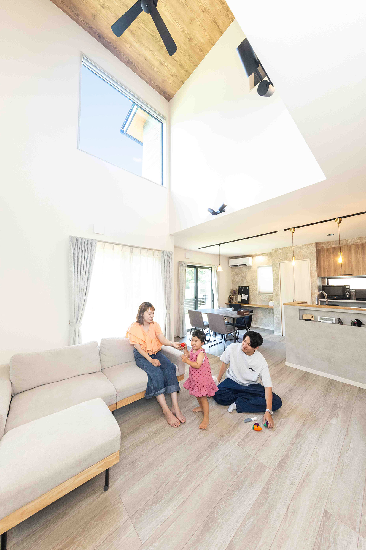 3. 明るい陽光が笑顔を照らす自然に溶け込む吹き抜けの家