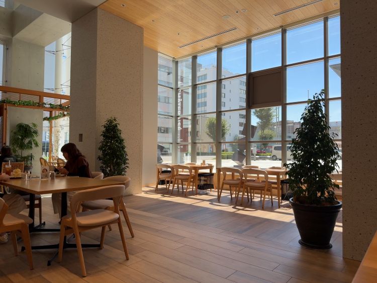 店内はガラス張りで光がたっぷり入り、天井が高くてとても開放的です。席数も多く、テーブル同士の間隔がゆったりしているので、ひとり時間にも友人とのおしゃべりにもぴったりです。大きな窓からは通りの様子が見えて、旅の余韻に浸りながら過ごすのにも心地よい雰囲気です。ホテル併設と聞くと少し敷居が高そうに感じるかもしれませんが、実際はカジュアルで利用しやすい空気感です。長野駅から近いので、電車の待ち時間や乗り換えの合間、観光やショッピングの休憩にも重宝します。つい長居したくなる快適さに驚きました。