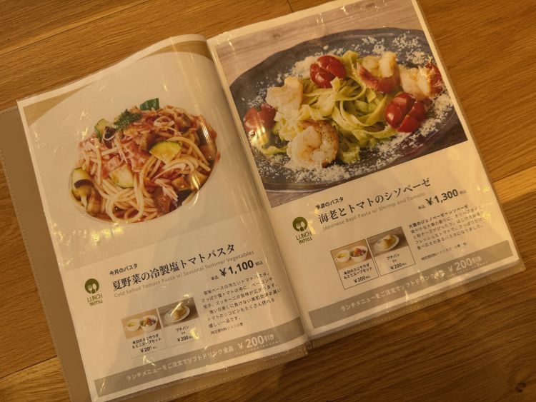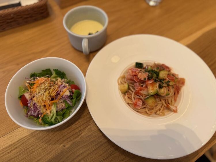 この日は「今月のパスタ」を目当てに訪れました。季節替わりで内容が変わるのが楽しく、今回は夏野菜の冷製塩トマトパスタでした。