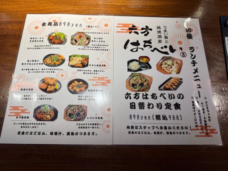 長野駅前でお昼の予定があり、ふと思い出して向かったのが「六方はちべい」です。夜は賑やかな居酒屋としておなじみのお店ですが、最近ランチ営業が復活したと聞いて、ずっと気になっていました。扉を開けると、夜の活気とは少し違う、やわらかな照明と落ち着いた空気に包まれていて、ほっと肩の力が抜けます。カウンターにはおひとりさま、テーブルには近くで働く方々、そして駅を利用する方の姿もあり、ほどよい賑わいが心地よいです。
