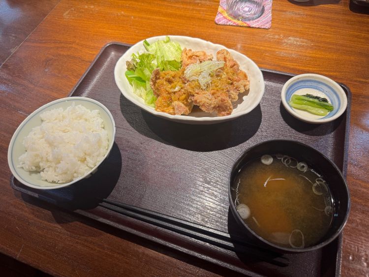 ランチメニューは数種類から選べて、どれもご飯とお味噌汁が付く定食スタイルです。今日は日替わりをお願いしたところ、登場したのは油淋鶏でした。