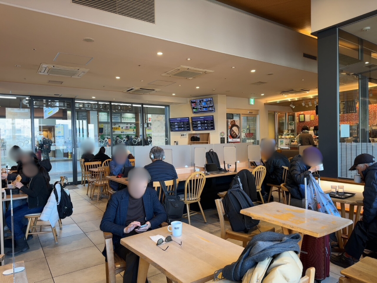 店内は通路がゆったりしていて、トレイを持って移動しやすい設計です。席の間隔も適度で、会話の声が気になりにくいのがありがたいです。朝の時間帯は出発前の利用が多く活気があり、昼過ぎは落ち着いて読書や作業に向く空気になります。