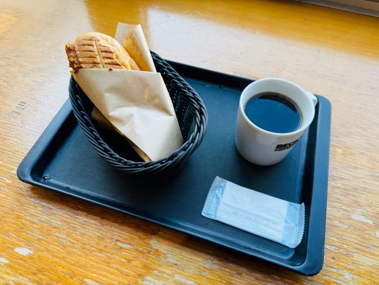 今回はポテト&ソーセージサンドとブレンドコーヒーを注文しました。入口すぐのカウンターは常に列ができていますが、提供はテンポよく進み、席につくまでの待ち時間は短めです。