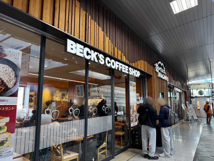 長野駅構内の「ベックスコーヒー」に立ち寄りました。関東エリア中心に展開するチェーンですが、こちらの店舗は特に広くて明るく、駅ナカとは思えないほど落ち着いて過ごせます。ガラス越しに新幹線ホームを見下ろすことができ、発着のリズムを眺めながら一息つけるのが魅力です。
