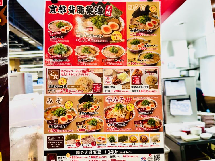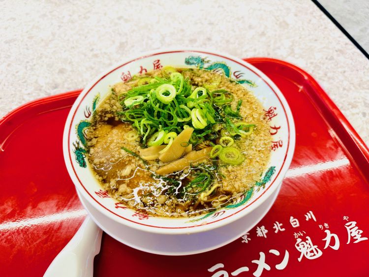 注文したのは看板メニューの「京都背脂醤油ラーメン」です。受け取った瞬間、醤油の香りと背脂の甘い香りがふわっと立ちのぼり、食欲をぐっと引き上げます。見た目は背脂がほどよく浮かび、こってり系に見えますが、一口すすると意外にも後味は軽やかです。