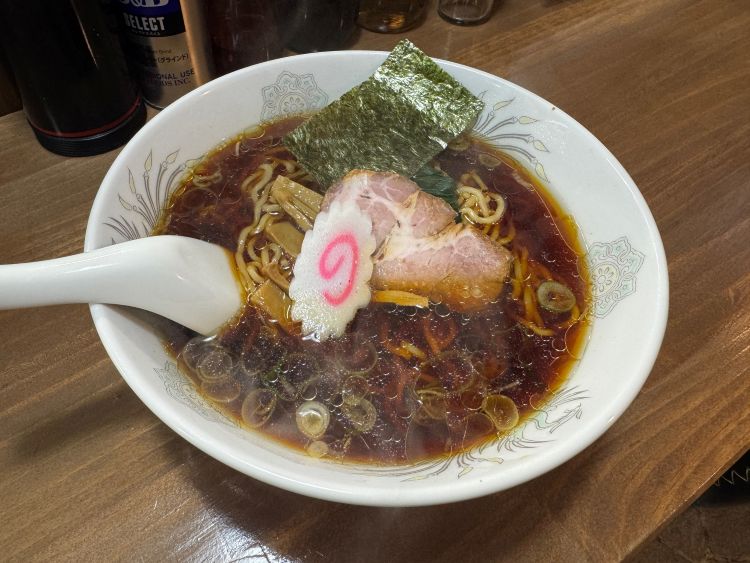 ほどなく着丼した一杯は、まず見た目が端正で、琥珀色のスープに細かな油がきらりと浮き、どこか懐かしい雰囲気が漂います。
