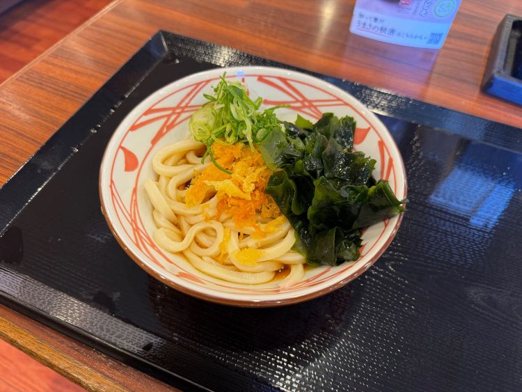 トッピングにはわかめを追加しました。瑞々しい海の香りがだしと相性抜群で、麺の合間にシャキッとした歯ざわりがアクセントになります。薬味はねぎ、天かす少し、わかめをプラスしました。どんな組み合わせでもだしが全体を上品にまとめてくれるのがぶっかけうどんの良さだとあらためて感じます。