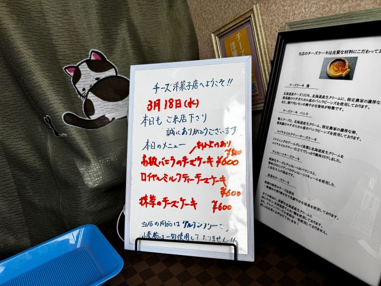 メニューはチーズケーキのみです。用意された三種類から好みを選ぶスタイルで、今回は三種類すべてをテイクアウトにしました。初めての方には一口サイズで味見をさせてもらえるので、風味の違いを確かめながら選べます。