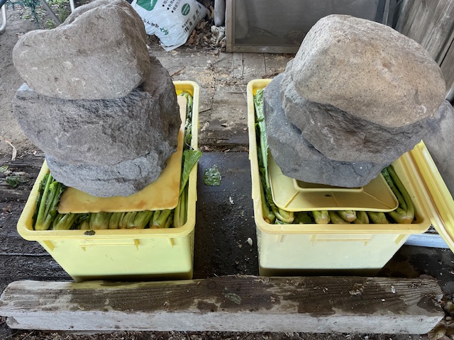 成功するか失敗するかのポイントは漬け込んで重石をして一晩で野沢菜の水分を出せるかどうかになります