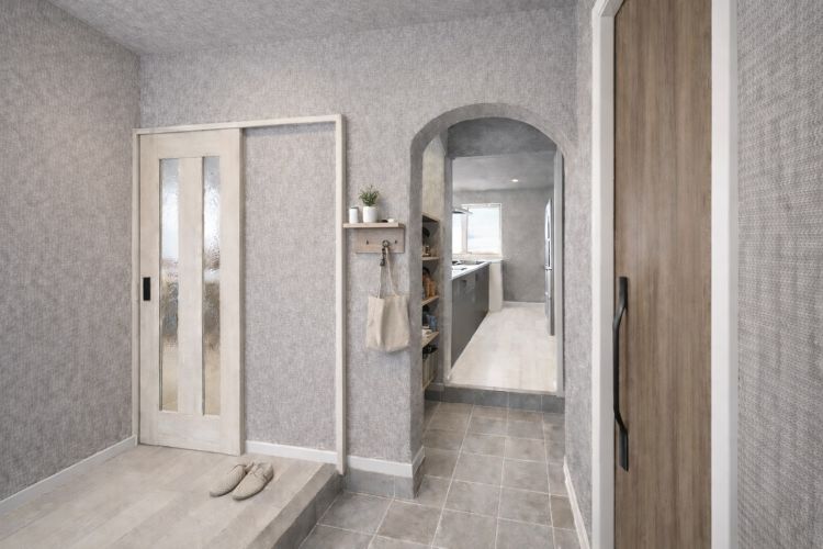 玄関から続く土間動線は、買い物帰りの荷物をパントリーへ直行できるルートを確保しています。上着やランドセルをしまえる収納も近くに配置し、帰宅後の“しまう場所”が迷子になりません。