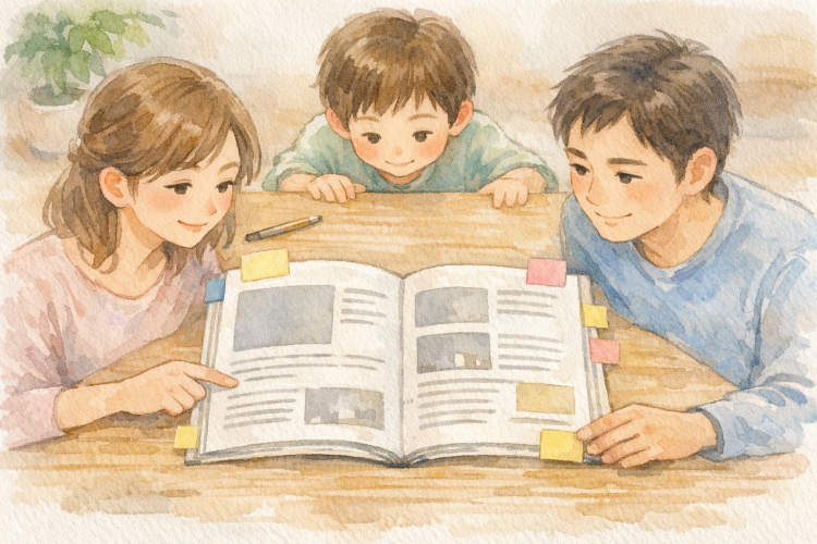 インターネットは情報が早く、施工事例も手軽に見られます。それでも紙の資料は、必要なところに付せんを貼ったり、ご家族で同じページを囲んだりと、落ち着いて比べやすい良さがあります。どの会社にしようかと考えるときに、色々な意見や考えを整理する助けになりますよ~。
